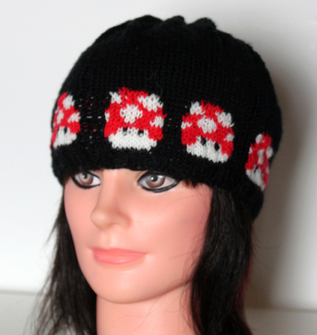Þegar stroffið er orðið nægilega langt skaltu auka út um 20 lykkjur jafnt yfir umferðina. Í næstu umferð á eftir byrjar munstur (sjá mynd). Húfurnar á myndinni eru með 8 sveppum, það er vel hægt að hafa færri. Passa verður að hafa lágmark 8 lykkjur á milli hvers svepps í fyrstu umferð (annars geta sveppirnir rekist á).