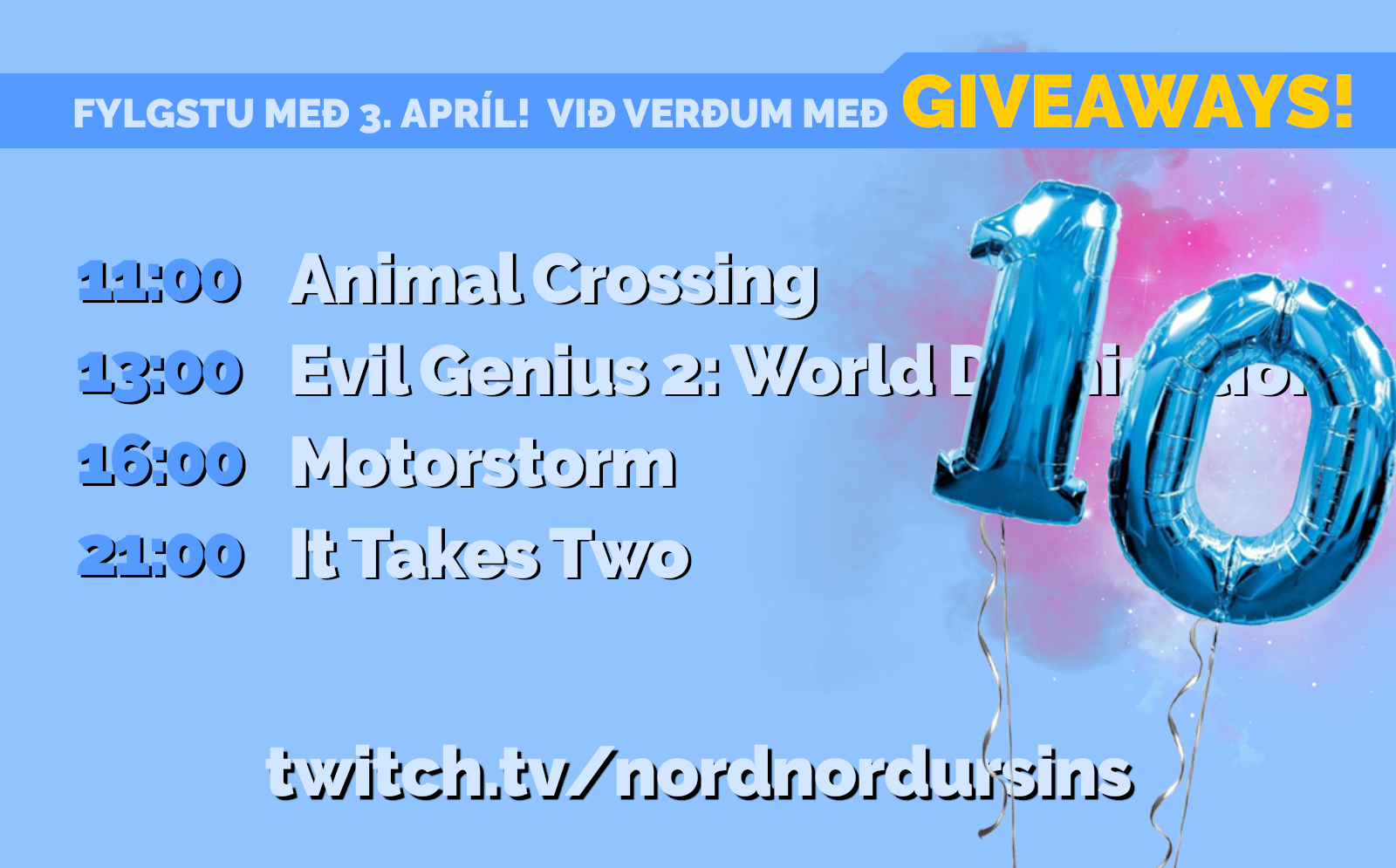 Af tilefni 10 ára afmælisins verðum við hjá Nörd Norðursins með sérstakt afmælisstreymi laugardaginn 3. apríl á Twitch. Þar mun Erla spila Animal Crossing, Daníel Rósinkrans spila Evil Genuis 2: World Domination, Sveinn Aðalsteinn spila Motorstorm og hjónakornin Erla og Bjarki Þór ljúka dagskránni með því að spila samvinnuleikinn It Takes Two á PlayStation 5.